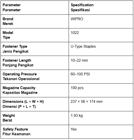 The WIPRO Air Stapler 1022 is designed for efficient fastening using U-type staples, making it ideal for upholstery, panel fixing, and light construction work. Its balanced design ensures stable operation and consistent performance across various materials.