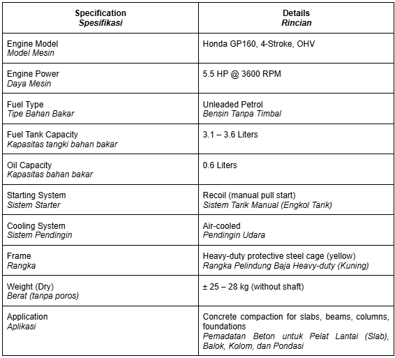 This concrete vibrator unit is powered by a Honda GX160 5.5 HP gasoline engine, designed to deliver reliable performance for construction and concrete works. Built with a sturdy protective steel frame and a solid base plate, it ensures stability and safety during operation while allowing easy transport on-site.