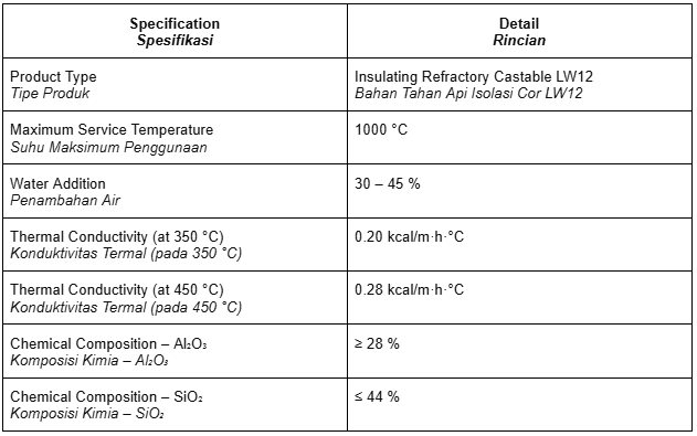 Mix LW-12 insulating castable by adding approximately 7.5–11 liters of clean water to each 25 kg bag (30–45% water ratio). Begin by placing about 80% of the required water into a mixing bucket or mechanical mixer, gradually add the castable while mixing continuously, then add the remaining water until a uniform, workable consistency is achieved similar to thick plaster or lightweight concrete. Mix for 3–5 minutes until fully homogeneous and free of dry lumps. The material can then be applied by casting into formwork, troweling onto surfaces, or plastering over insulation layers such as ceramic fiber blanket. Spread the castable evenly to the required thickness, compact lightly to remove air pockets, and finish with a trowel. After installation, allow the material to cure for at least 24 hours before gradual heating to ensure proper strength development and prevent cracking.