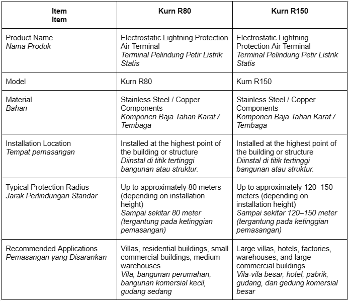 BBS supplies Kurn electrostatic lightning rods, including the Kurn R80 and Kurn R150 models. The R80 is commonly used for villas and medium-sized buildings, while the R150 is designed for larger structures requiring a wider protection radius.