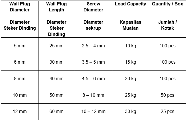 Tapered at one end for quick and easy insertion, each wall plug size caters to specific load requirements and ensures robust anchoring when paired with the appropriate screw diameter. These wall plugs offer a versatile and reliable fastening solution for various material types, including concrete, solid brick, perforated brick, lightweight concrete, aerated concrete, and stone.