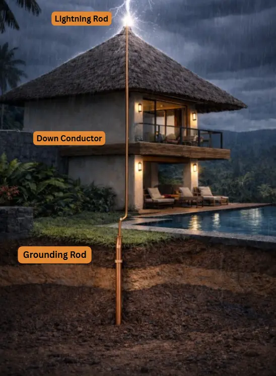 In Bali, lightning strikes are part of everyday life—especially during the rainy season. With tropical storms, high humidity, and many buildings exposed on open land or coastal areas, lightning protection is not optional. It is a critical safety system for any villa, warehouse, hotel, or commercial building.