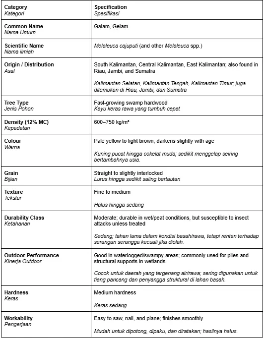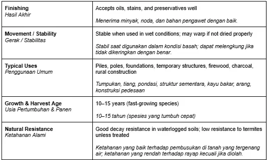 Daya Tahan : Cukup tahan lama; tahan terhadap pembusukan di kondisi basah tetapi dapat rentan terhadap serangan serangga jika tidak dirawat