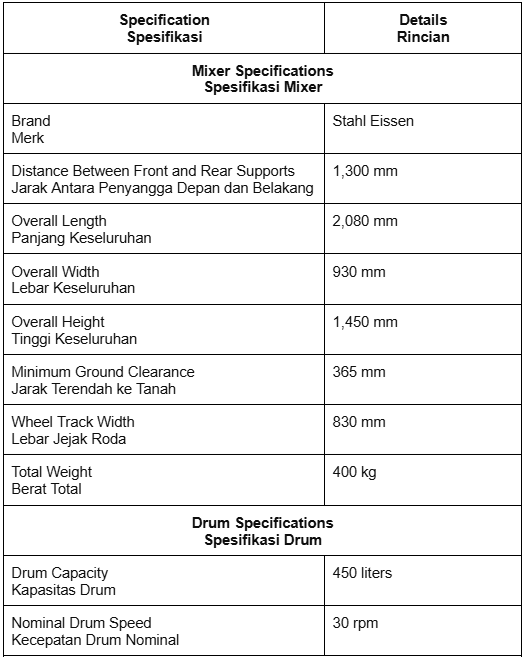 The Stahl Eissen Drum Concrete Mixer is a heavy-duty, high-capacity machine designed for efficient mixing of concrete on construction sites. Equipped with a 450-liter drum and a nominal speed of 30 rpm, it ensures consistent and thorough blending of materials. Powered by a robust 1 HP Wipro motor with a 4,500-watt input, this mixer delivers reliable performance at low speed for optimal mixing. Built with a sturdy steel frame, 400 kg total weight, and durable wheel support, it is engineered for stability, mobility, and long-term use in demanding work environments.