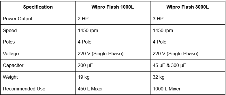 From Wipro, the FLASH-3000L (3 HP, 1450 rpm, 4-pole, 220 V) is recommended for the 1000 L mixer. With nearly double the wet load compared to the 500 L mixer, a higher horsepower motor is required to maintain smooth startup and continuous rotation under load. The 3 HP motor provides ample torque reserve, ensuring durability, reduced strain on the gearbox, and consistent mixing even with stiffer concrete batches.