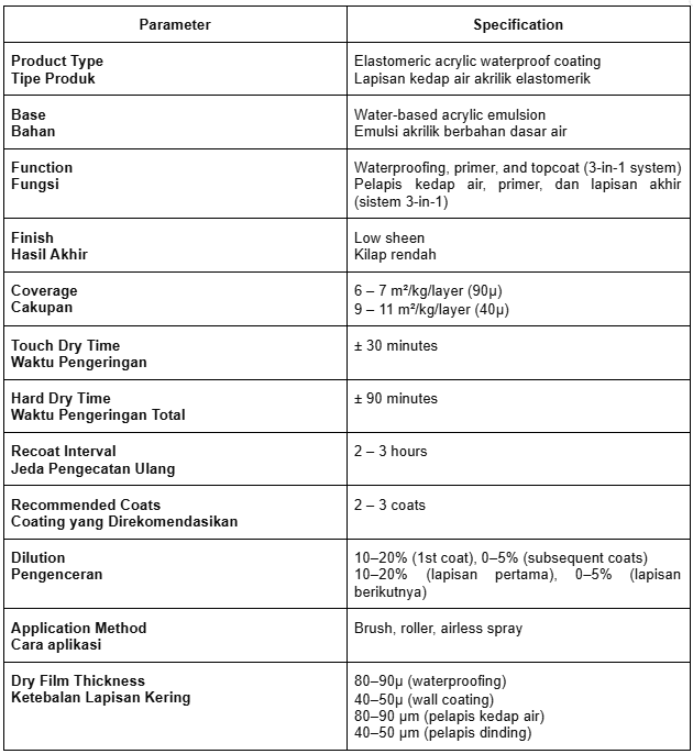Nippon Elastex Waterproof 3-in-1 is a flexible coating system designed to handle movement, moisture, and exposure in demanding environments. Its elastomeric properties allow it to stretch and bridge hairline cracks, making it particularly effective for surfaces prone to minor movement or thermal expansion.