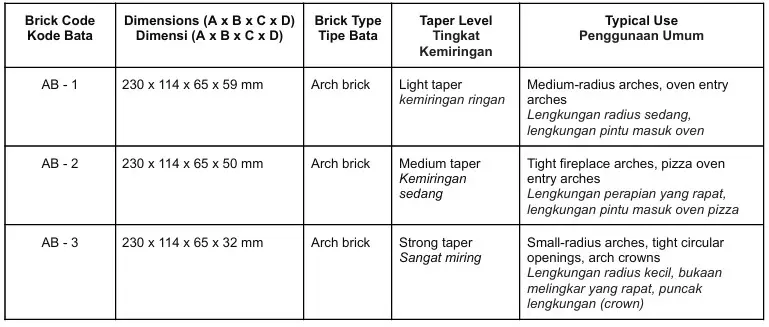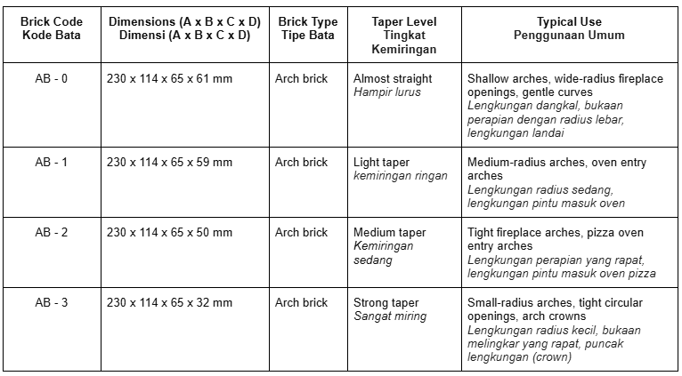 The range includes straight firebricks for flat firebox walls and oven floors, arch firebricks for forming strong and clean fireplace or oven openings, wedge firebricks for curved walls and dome construction, and key firebricks used to lock arches and domes at critical structural points. Each brick profile is engineered to suit specific geometry, allowing proper load distribution and reducing the need for thick mortar joints.