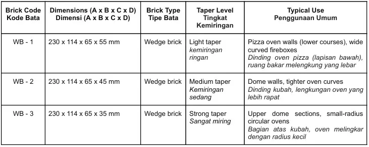 The range includes straight firebricks for flat firebox walls and oven floors, arch firebricks for forming strong and clean fireplace or oven openings, wedge firebricks for curved walls and dome construction, and key firebricks used to lock arches and domes at critical structural points. Each brick profile is engineered to suit specific geometry, allowing proper load distribution and reducing the need for thick mortar joints.