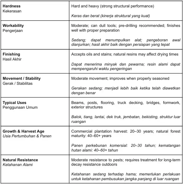 Found in Kalimantan (Borneo), Sumatra, and parts of Sulawesi. It grows in lowland tropical rainforests.Used in heavy-duty construction, flooring, outdoor furniture, railway sleepers, boat building, and structural work.
