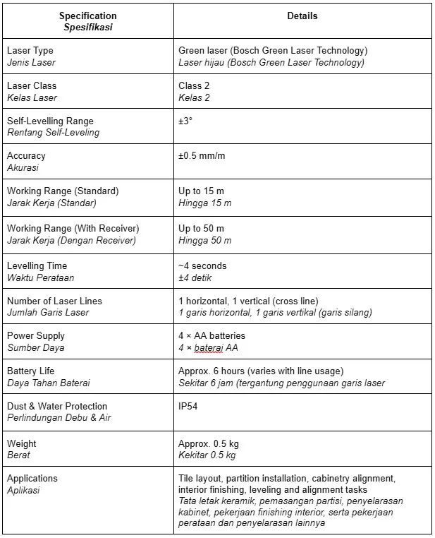 The Bosch GLL 50-15 XG laser level is a highly visible green-line laser designed for fast, precise alignment across a wide range of interior construction tasks. Its bright cross-line projection makes it easy to establish level and plumb references during tiling, partition work, cabinetry installation, and other finishing activities.