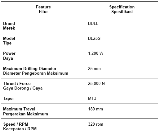 The BULL BL25S is a professional-grade magnetic drill designed for precision and efficiency in metalworking and industrial applications. Its robust magnetic base ensures secure attachment to steel surfaces, allowing for stable, accurate drilling even in vertical or overhead positions. Built for durability, the BL25S features a strong motor and reliable construction that can handle continuous use in workshops, fabrication shops, and on-site projects. With easy-to-use controls and smooth operation, this drill is ideal for engineers, fabricators, and technicians who require consistent performance for heavy-duty tasks.