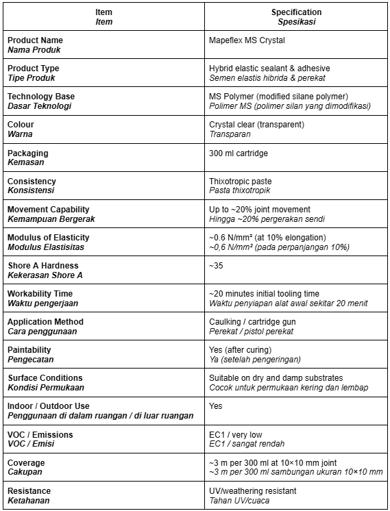 Mapeflex MS Crystal is a high-clarity hybrid sealant and adhesive formulated with MS Polymer technology, designed to deliver practically invisible joints without compromising performance. Its crystal clear finish makes it ideal for applications where aesthetics matter, such as glass, mirror, and transparent material detailing.