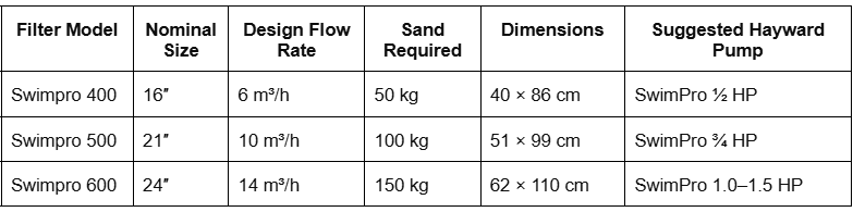 The Hayward Swim Pro Sand Filter series is engineered for reliable and efficient pool water filtration. Constructed from durable, corrosion-resistant materials, these filters ensure long-lasting performance in both residential and commercial pool environments. Designed for optimal flow and easy maintenance, each unit uses a multiport valve system that simplifies backwashing and cleaning operations. The deep, uniform sand bed provides superior filtration clarity, removing fine particles and maintaining consistently clean water with minimal effort. Compact yet powerful, the SwimPro sand filters are ideal for small home pools through to larger villas and commercial facilities, offering a perfect balance of durability, performance, and user convenience.