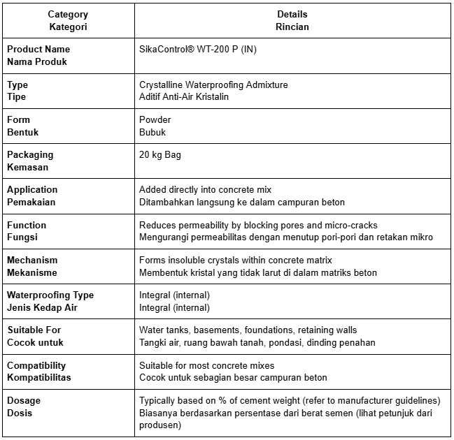 SikaControl® WT-200 P is a powder-based crystalline waterproofing admixture added directly into concrete during mixing. It reacts with moisture and unhydrated cement particles to form crystals that block capillary pores and micro-cracks, reducing water penetration.